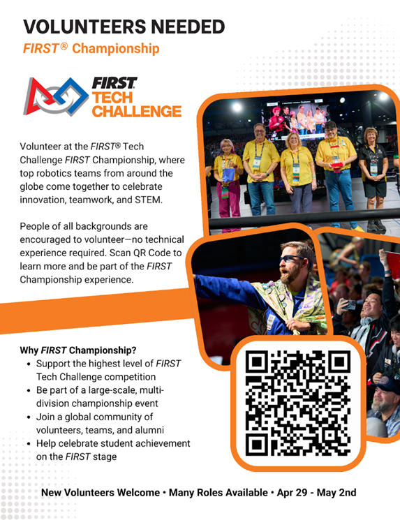 Ayrıca Çarşamba günü için takım koçları ve ebeveynleri tek günlük robot denetçisi olarak görevlendirmeyi umuyoruz. FIRST Şampiyonası’na takımınızla birlikte seyahat eden ve ilgilenen yetişkinler varsa, lütfen onları gönüllü olarak kaydolmaya teşvik edin!